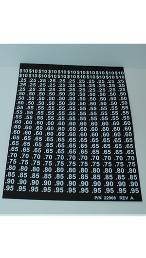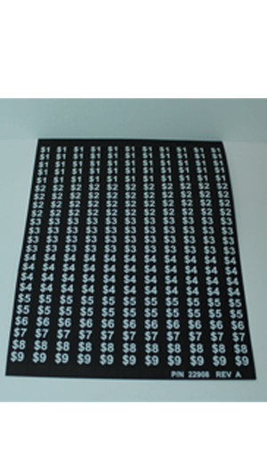 Label sheet, reduced height, price W/$ for AMS vending machines.